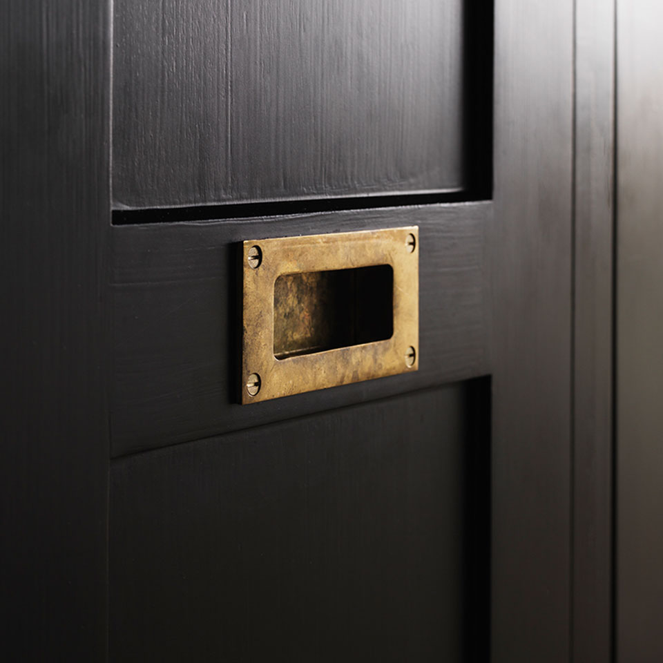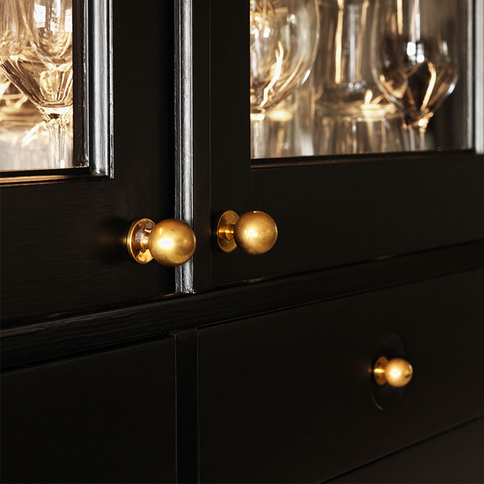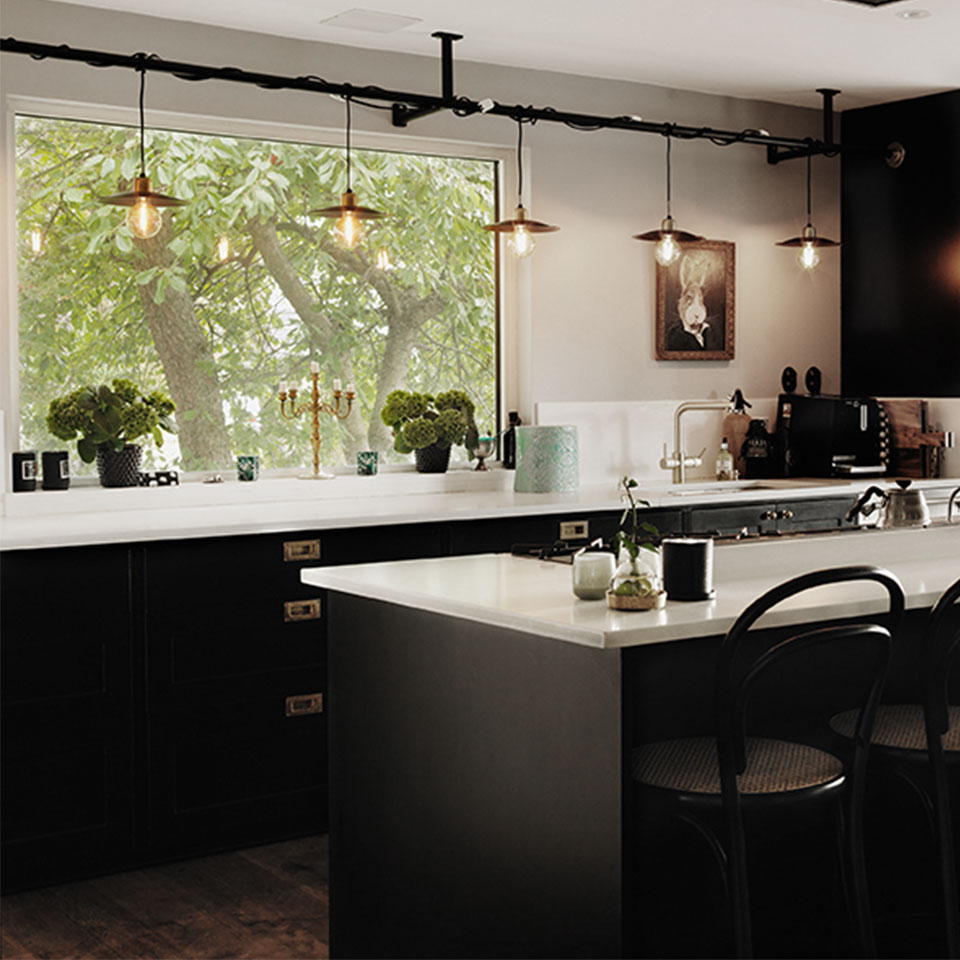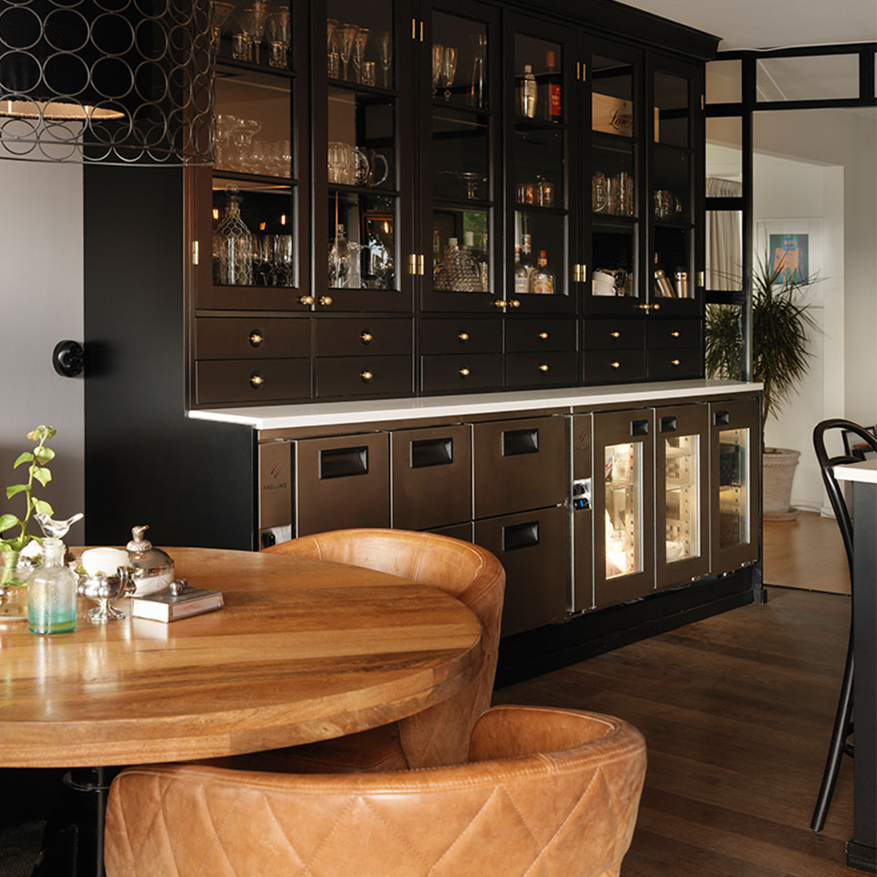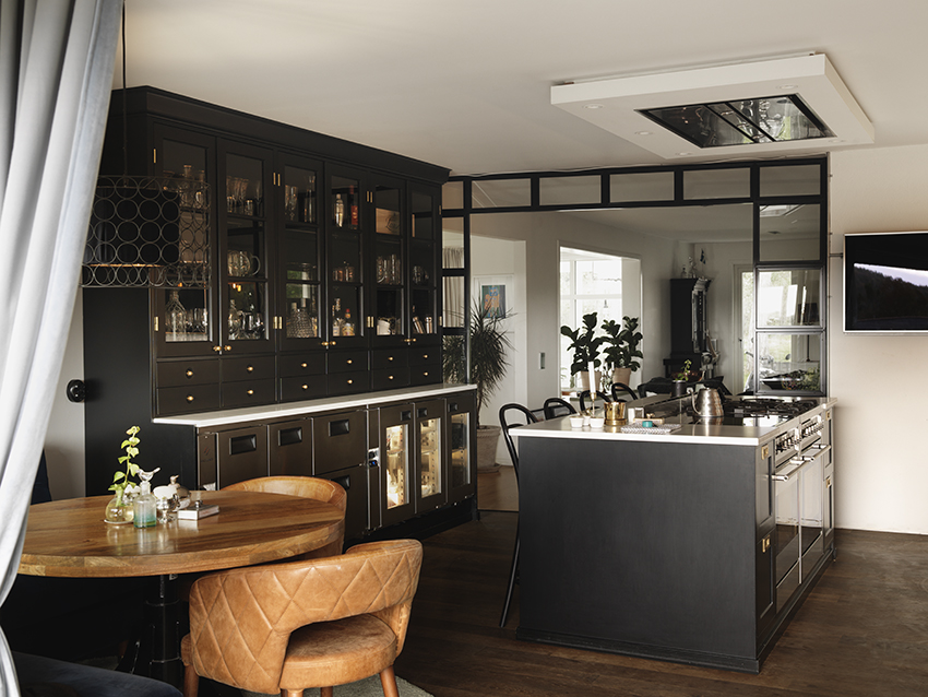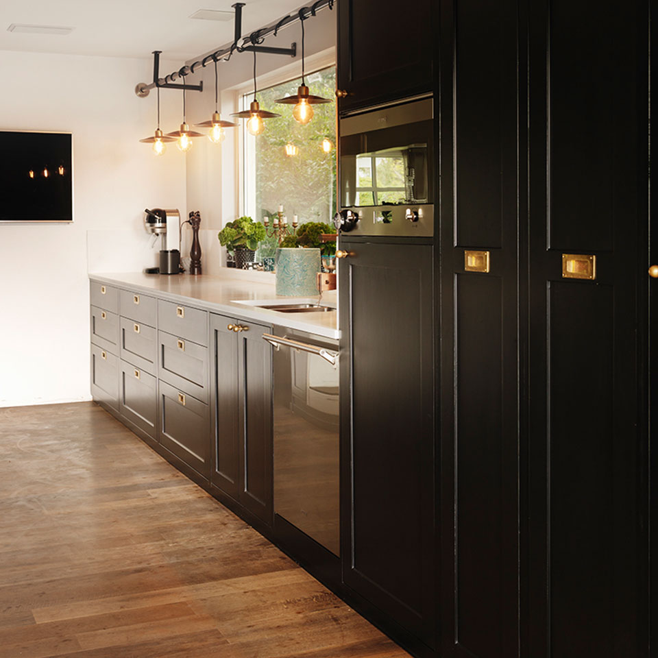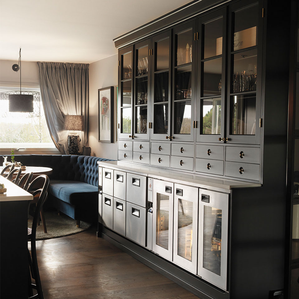 Ett svartmålat handmålat kök med fronter och dörrar i massivträ. Beställaren är kock och har höga krav på kvalitet och funtionalitet. I fransk bistrostil med vitrinskåp upp till tak och krönlister. Restaurangkylar, dubbla spisar och bänkskiva i kvartskomposit.